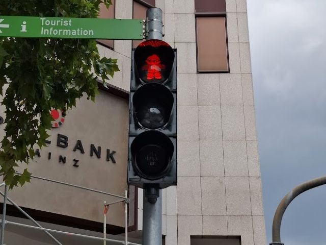 マインツにも、アンペルマンならぬ独特な歩行者信号が。青信号、撮り損ねました。「マインツェルメンヒェン」と呼ばれる6人のご当地キャラのひとり。眼鏡をかけた男の子です。
