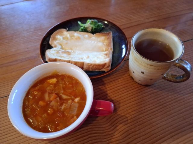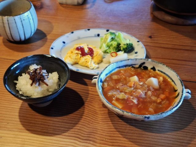 残りのミネストローネの朝食。ミネストローネの日は、なぜか目玉焼きではなくスクランブルエッグになります。