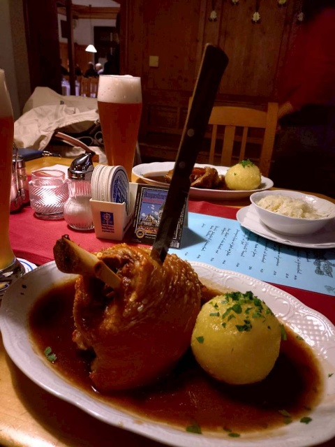 もう一皿のシュバイネブラーテン。玉葱みたいなのは、クヌーデル。じゃが芋と固くなったパンを丸めて茹でたつけ合わせの定番です。