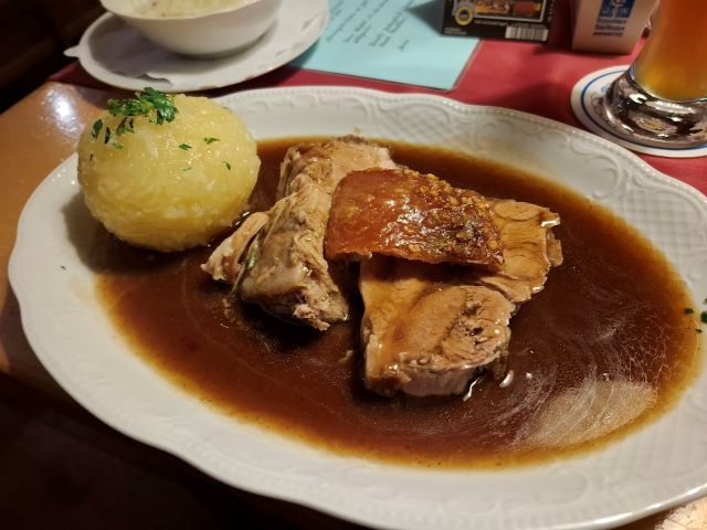 もうひと皿のシュバイネブラーテン(豚肉のほかの部位で作った同じような料理)も、シュバイネハクセと同じ味つけだったが、口に入れた途端とろけるおいしさだった。