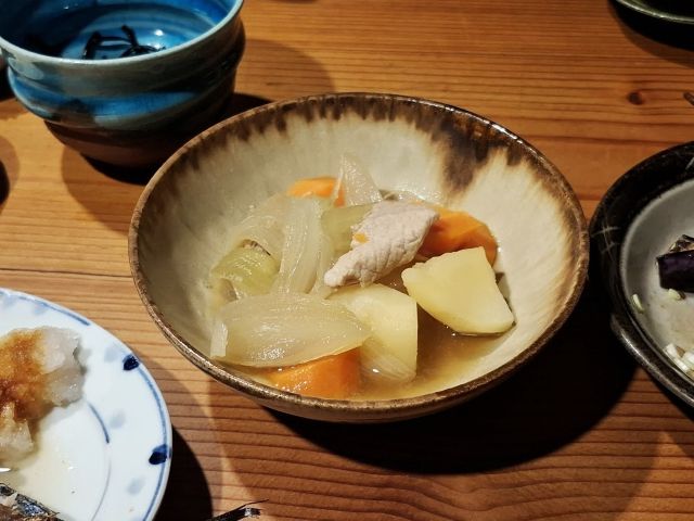 シラタキのない肉じゃが。笠間で見つけた器です。写真はありませんが、左手前に鰺の塩焼き、右には焼き茄子。