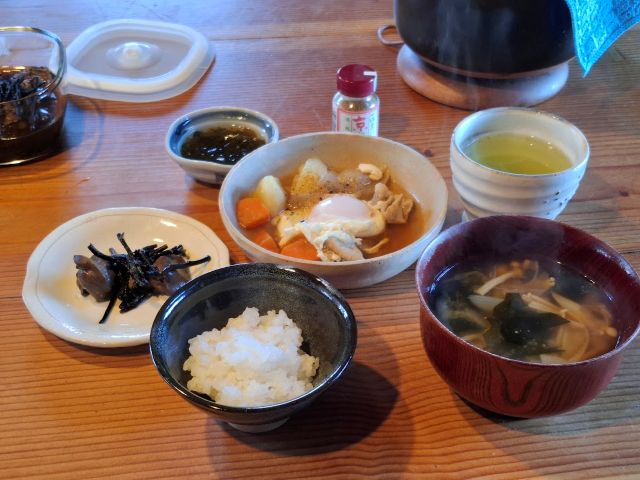翌朝は、肉じゃがに卵を落として。