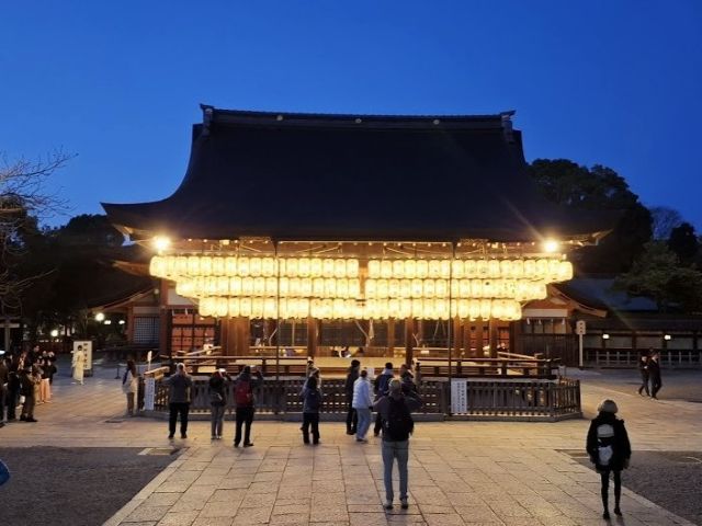 八坂神社。お参りして、夜の祇園へ。この日は22,000歩、歩きました。