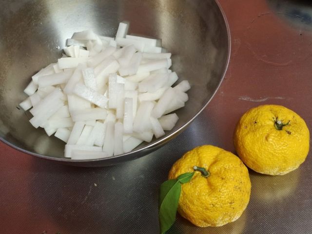 ほぼ大根1本の半分くらいだ。それに大きめの柚子を1個使う。