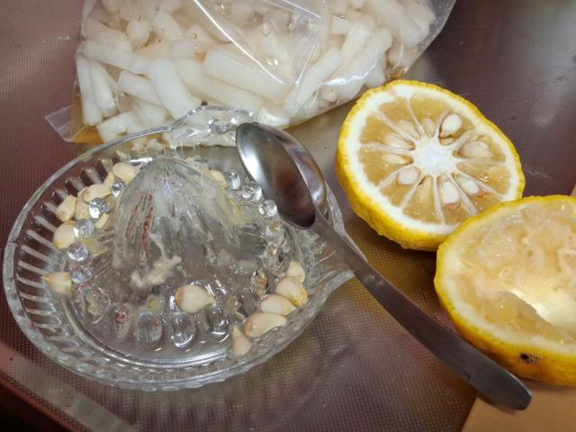 大根500gに、柚子はこのくらいの大きいものを1個。果汁を搾って、皮は千切りに。