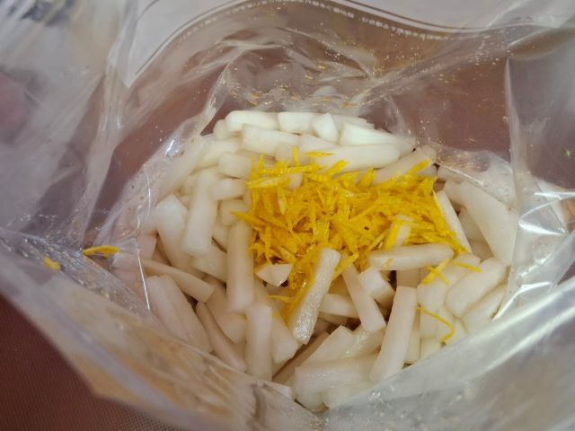 大根は、拍子木切りにして、塩で揉んでから漬けます。