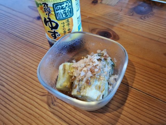 翌朝残りに、鰹節と柚子ポンをかけて食べた。