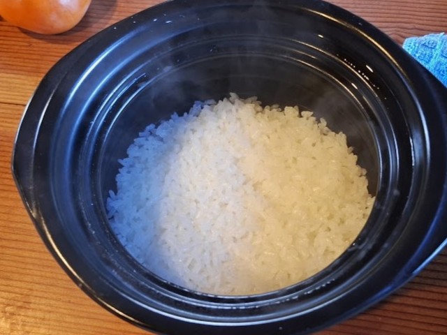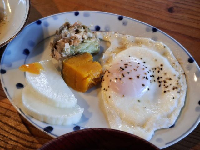 定番のご飯、お味噌汁、目玉焼きの朝食。