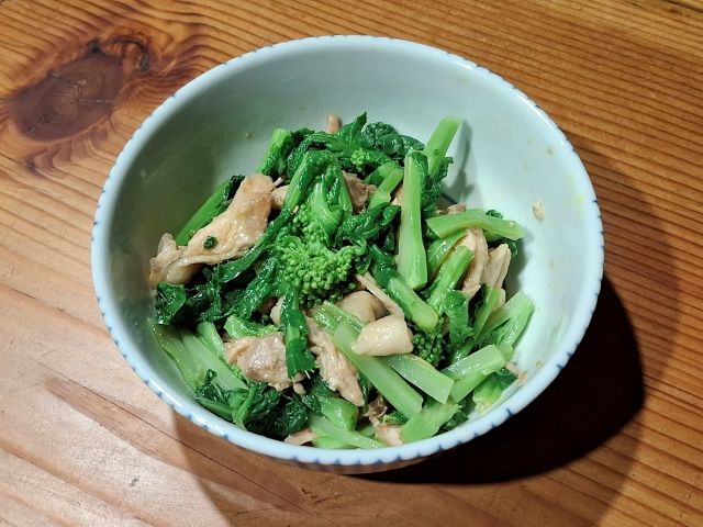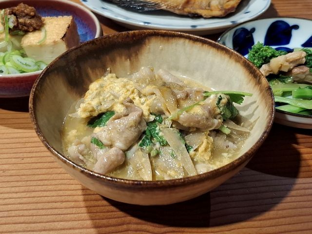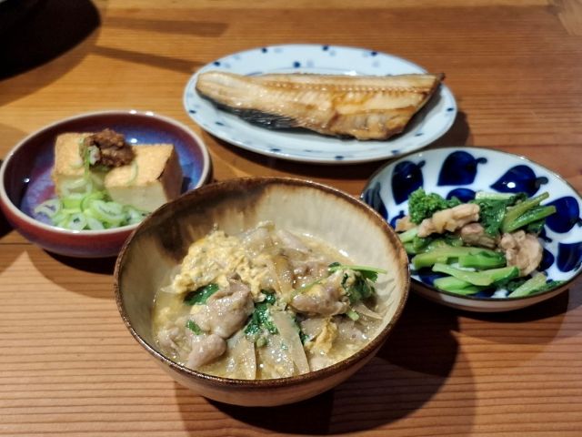 メニューは、豚柳川、ホッケの干物、菜の花と鶏の辛子和え、厚揚げ焼き。
