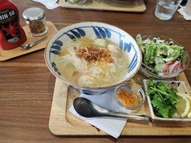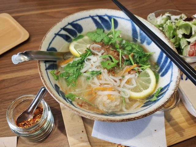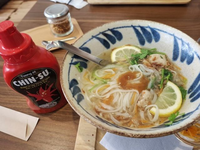 ちょうど先週、ランチに食べたフォー・ガー(鶏肉のフォー)で、けっこう辛い唐辛子と、ベトナムの調味料チンスを出してくれて、何も入れない、唐辛子、チンスと3段階の「味変」を楽しんだ。