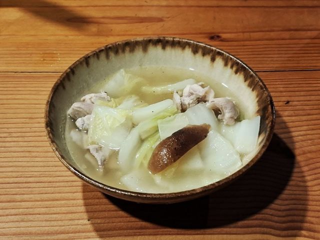 干し椎茸の戻し汁に水を足し、適当に切った椎茸を入れて火にかける。味つけは、鶏がらスープの素を大さじ一杯ほど。