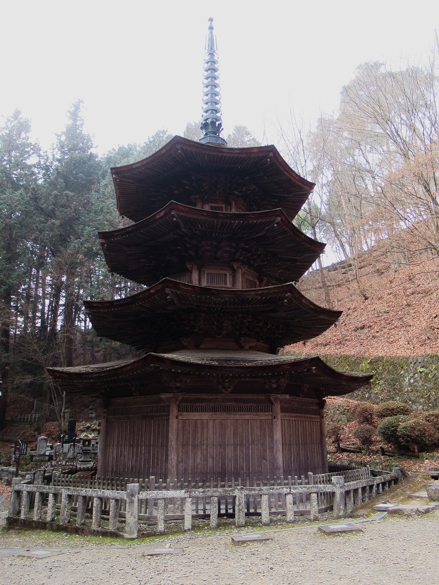 「八角三重塔」は、日本唯一の木造八角塔。中国宋時代の「禅宗様」という建築様式で、一番下の屋根に見える部分はひさし。昔は四重の塔といわれていたといいます。