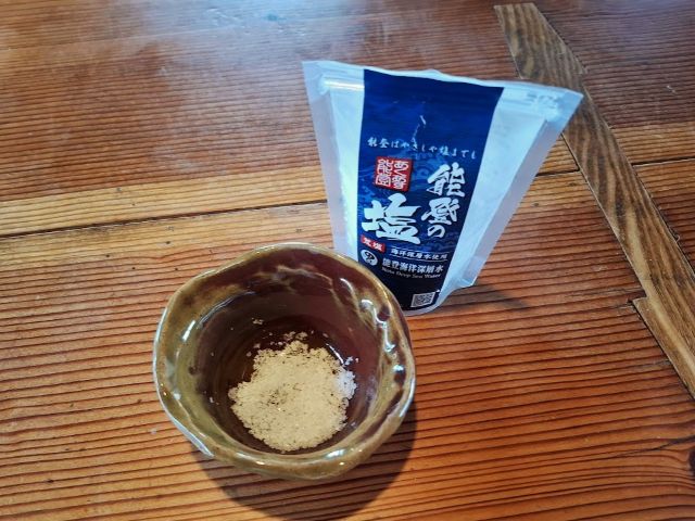 能登の塩です。粒が粗くて、見るからにミネラル豊富な感じがします。