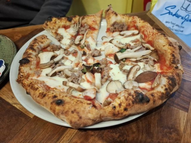トマトベースのサルシッチャときのこのピザ。