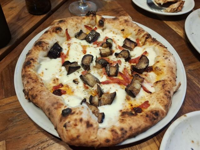 チーズが利いた茄子とサラミのピザ。シェアしてお腹いっぱい食べました。