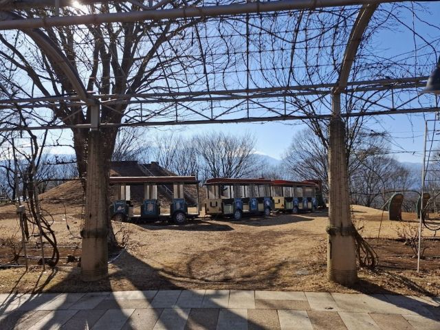 遊覧トレインもお休み中。バラのアーチでは、10人ほどのスタッフさんが選定作業をしていました。