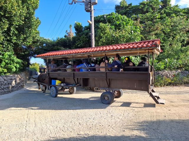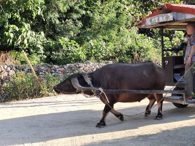 赤瓦の屋根が並ぶ町並みを、歩いた。オレンジ色の独特の瓦葺きの屋根には、口を開けたシーサーが乗っかっている。足もとの道は、白い砂。珊瑚が砂になったものを敷き詰めているらしい。水牛車は、何台もあるらしく、大きな水牛が車を引きゆっくりと通り過ぎていった。