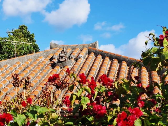 赤瓦の屋根。乗っかっているシーサー。ブーゲンビリアの道。たわわに生っているバナナ。途中、ガイドの男性は、三線(さんしん)を弾き、沖縄民謡や島唄などを歌ってくれた。