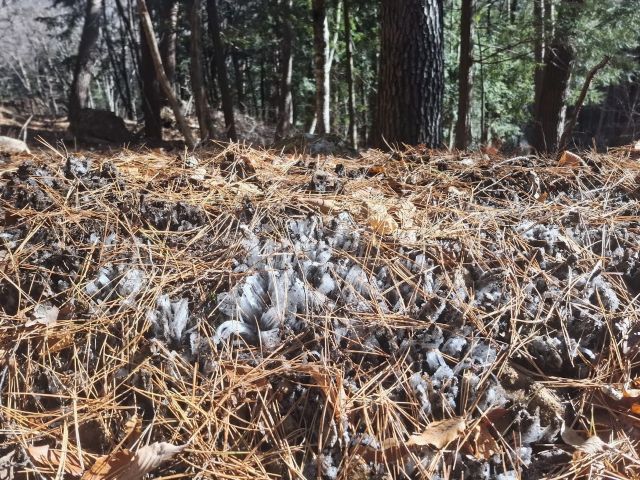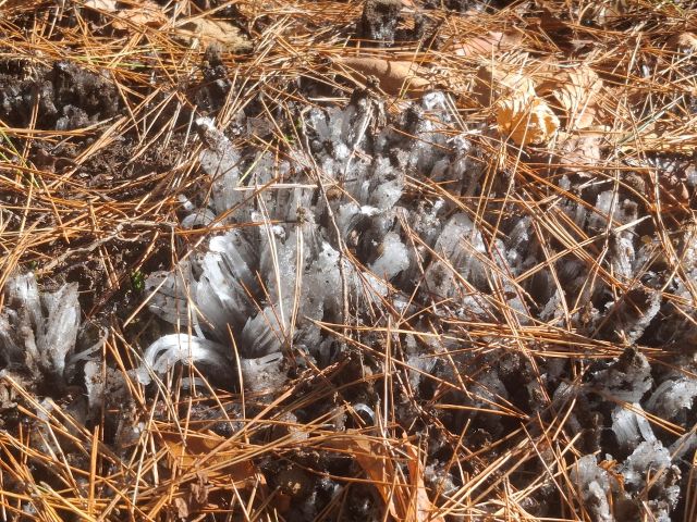 松葉が落ちた地面を押し上げるように、霜が長く伸びています。